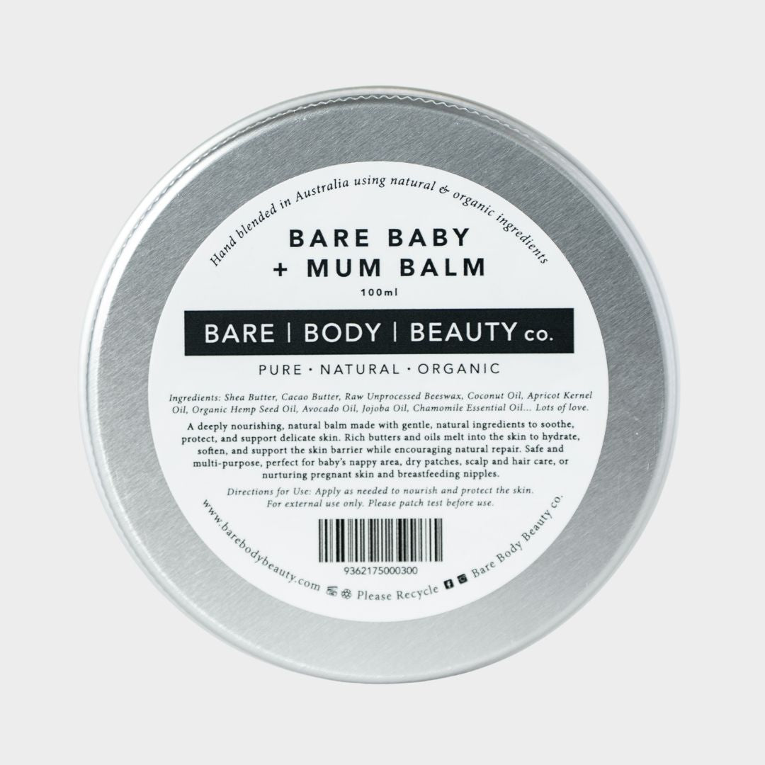 Safe, pure, and multi-purpose, Bare Baby Balm is your go-to for nappy care, dry patches, soothing baths, gentle hair styling, and nurturing pregnant skin.